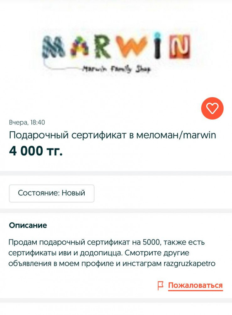 Авторы объявлений предлагают приобрести сертификат по заниженным ценам. К примеру, сертификат стоимостью 10 тысяч тенге счастливая обладательница предлагает приобрести за 8 тысяч.