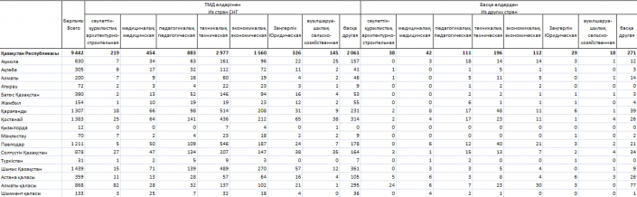 С точки зрения специальностей больше всего из Казахстана уехало людей технических профессий - 3 123 человека. Кроме того, среди уехавших есть 1 672 экономиста, 994 педагога, 496 медиков, 355 юристов, 257 архитекторов и строителей и 163 сотрудника отрасли сельского хозяйства.
