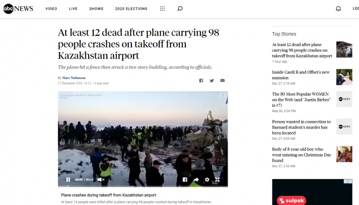 Америкалық ABC телеарнасының жаңалықтар бөлімі Алматыдағы апатты күннің негізгі жаңалығы ретінде сайттың негізгі бөлігіне жариялаған. Сайтқа кірген бойда көзге Қазақстандағы апат пен оның суреті түседі.