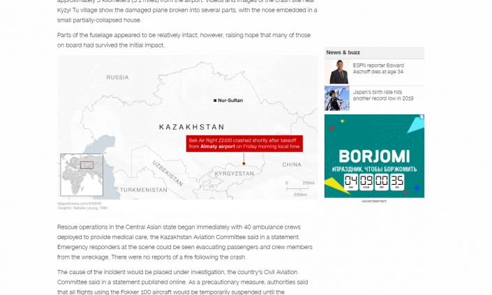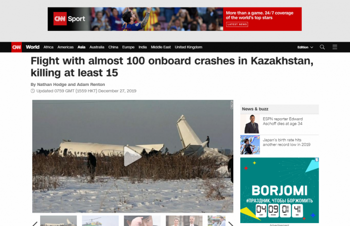 Америкалық CNN басылымы бүгінгі оқиғаға байланысты "Қазақстанда бортта 100-ге жуық адам болған ұшақ құлады, кем дегенде 15 адам қаза тапты" деген тақырыппен ақпарат таратқан.