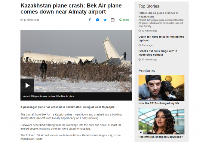 "Bek Air ұшағы Қазақстанның ең үлкен қаласы Алматыдан ел астанасына ұшқан соң бетон дуал мен екіқабатты ғимаратқа соққан. Алматы халықаралық әуежайында ол таңғы 7:22-де (Гринвич бойынша 01:22) құлаған", - деп жазылған материалда.