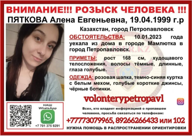 Если вам что-нибудь известно о местонахождении Алены Пятковой, позвоните по телефонам: +7-777-307-99-65, 8-926-626-64-33 или 02.