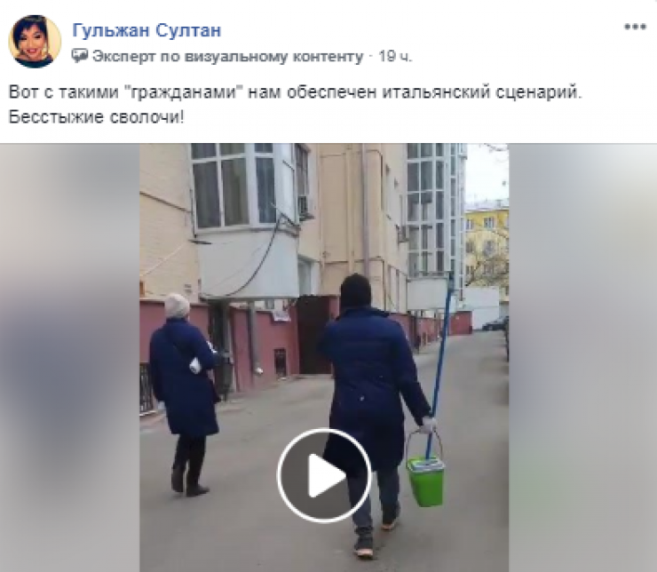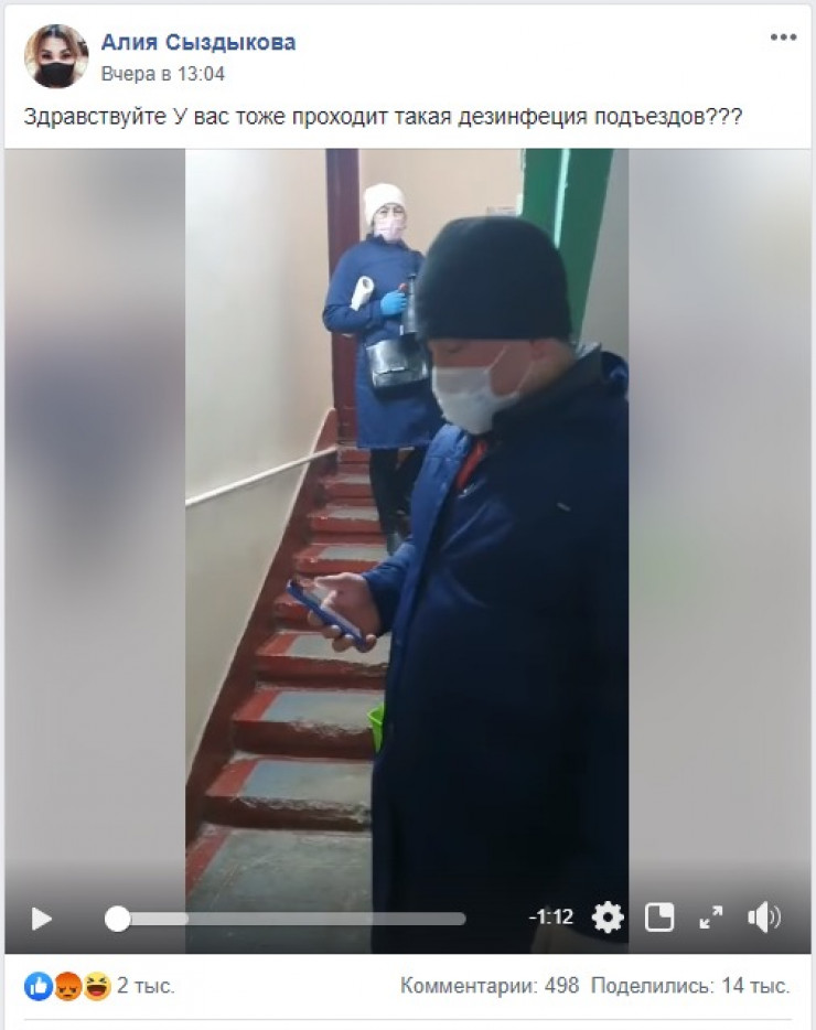 "Пользователь Facebook опубликовала видео, которое якобы было снято в одном из домов в Нур-Султана, что представители КСК не дезинфицируют подъезд, а делают фотографии. Это ложная информация. Этот случай произошел в Москве, на телеканале НТВ вышел сюжет с кадрами этого подъезда. Я призываю граждан не распространять ложную информацию и не вводить людей в заблуждение. За распространение ложной информации предусмотрена ответственность",  - сказала пресс-секретарь акима Нур-Султана Акмарал Олжабаева.