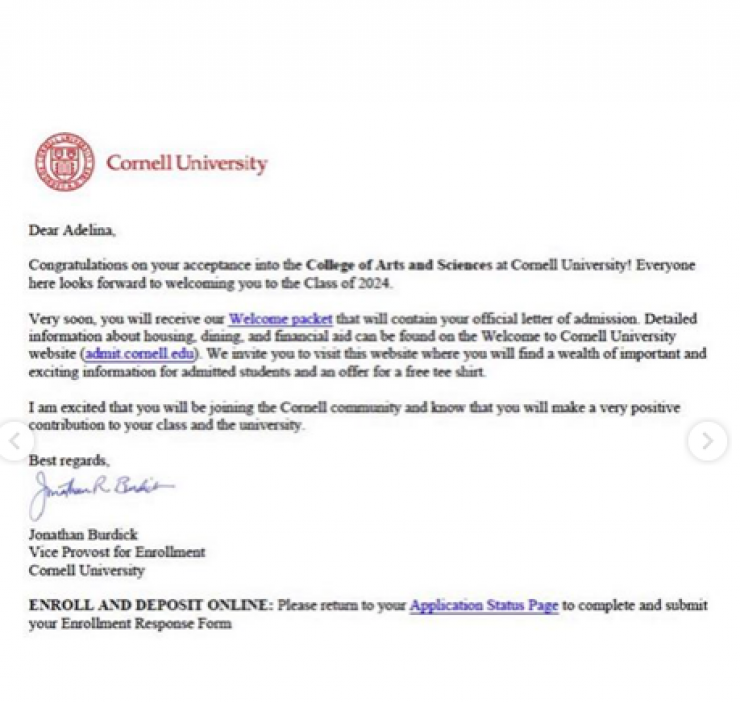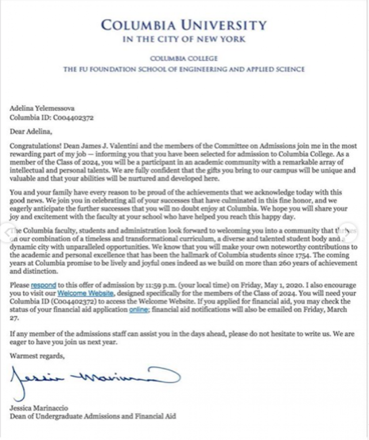Среди вузов, пригласивших казахстанку, два университета Лиги плюща, а именно Колумбийский университет (Columbia University) и Корнелльский университет (Cornell University) США.