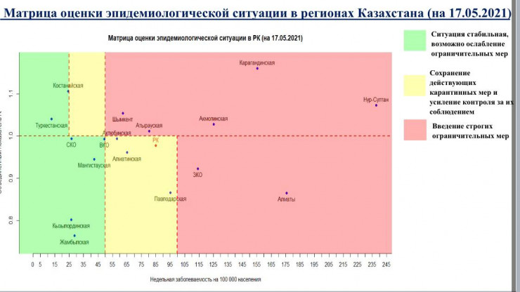 Согласно матрице оценки эпидемиологической ситуации в регионах Казахстана на 17 мая 2021 года, в "красной" зоне находятся города Нур-Султан, Алматы, Шымкент, Акмолинская, Атырауская, Западно-Казахстанская и Карагандинская области.