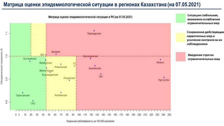 Таким образом, в "красной" зоне: города Нур-Султан, Алматы, Шымкент, Акмолинская, Западно-Казахстанская, Карагандинская, Павлодарская области.