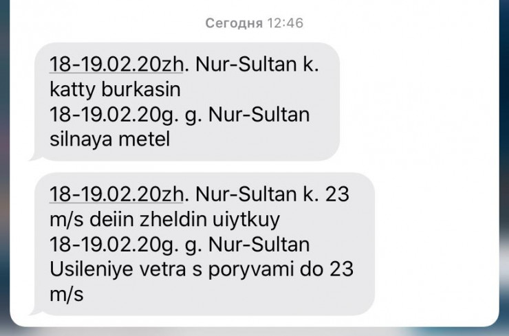 Отметим, что жители Нур-Султана получили SMS-рассылку от Комитета по чрезвычайным ситуациям о штормовом предупреждении.