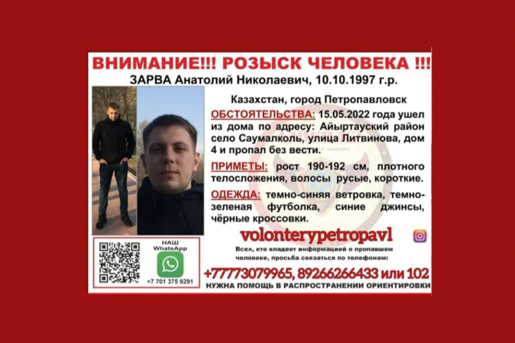 25 мая в отдел полиции Айыртауского района поступило заявление о том, что 15 мая утром 24-летний Зарва Анатолий Николаевич ушел из дома в райцентре Саумалколь и не вернулся. В поисках молодого человека задействованы: полицейские, волонтеры, сотрудники местных исполнительных органов и просто неравнодушные люди. Фотоориентировки на без вести пропавшего разосланы во все территориальные подразделения полиции; в чаты мессенджеров, также данная информация отправлена администраторам популярных групп в социальных сетях.