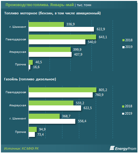 Лидерами по производству дизельного топлива стали Павлодарская область (760,9 тысячи тонн), Атырауская область (622,5 тысячи тонн) и Шымкент (556,4 тысячи тонн).