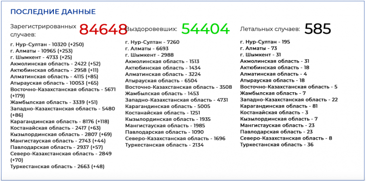 Отметим, что по словам Бакытжана Сагинтаева, в Алматы умерли 73 человека. По официальным данным, в 81 пациент скончались в Карагандинской области, 36 в Туркестанской области.