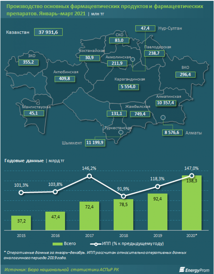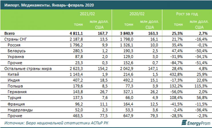 Несмотря на рост производства, в Казахстане увеличивается и импорт медикаментов. Так, за январь – февраль 2021 года в страну завезли 4,8 тысячи тонн медикаментов на 167,7 миллиона долларов США.
