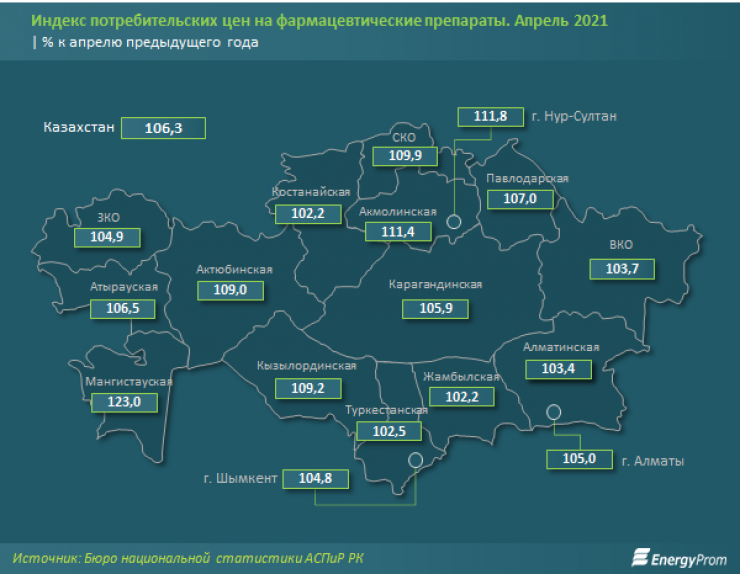 "Сильнее всего рост цен ощутили жители Мангистауской области - сразу на 23 процента за год. По годовому росту цен также "лидируют" столица (плюс 11,8 процента) и Акмолинская область (11,4 процента). Среди основных фармацевтических препаратов наибольший рост цен в годовой динамике наблюдается у таких препаратов, как пятипроцентный спиртовой раствор йода, "Эссенциале форте Н", 90%-ный этиловый спирт, "Корвалол", "Аквалор Форте спрей". Падение цен было отмечено для таких препаратов, как "Гипотиазид", ацетилсалициловая кислота", - пишут аналитики.
