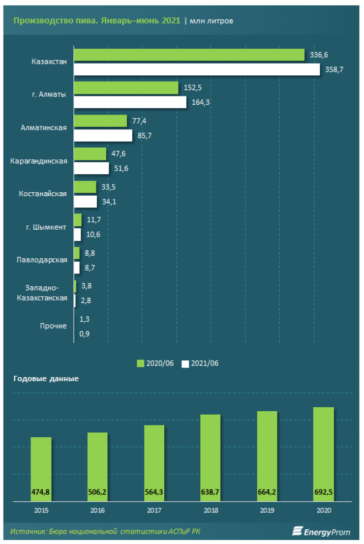 В самом Казахстане за первое полугодие текущего года произвели 358,7 миллиона литров пива - на 6,6 процента больше, чем годом ранее.