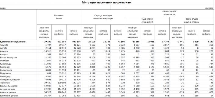 Прибыло в страну 12 785 человек. Больше всего людей прибыло в Алматинскую - 1 814 человек. В сам Алматы за год прибыли 1 447 человек. Также в Мангистаускую область прибыл 1 621 человек.