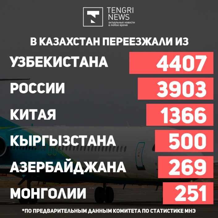 Переезжали в Казахстан чаще всего жители Узбекистана - 4 407, России - 3 903, Китая - 1 366 и Кыргызстана - 500.