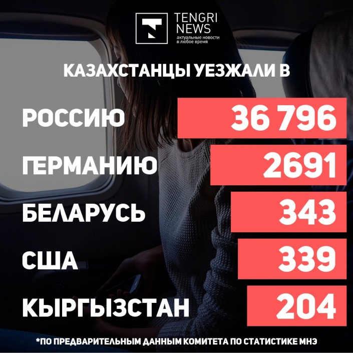 Больше всего казахстанцев уехало в Россию - 36 796 человек, Германию - 2 691 человек, в Беларусь - 343 человека и в США - 339 человек.