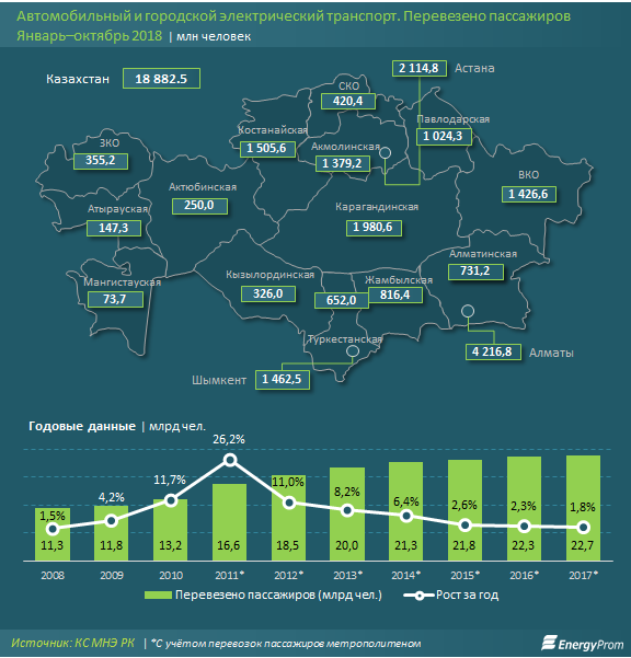 Наибольший рост перевозок пассажиров пришелся на Кызылординскую область: +8,7 процента за год, до 326 миллионов человек. Это связано с открытием современного автобусного парка, рассчитанного на 200 единиц общественного транспорта. Для его строительства из бюджета было выделено 2 миллиарда тенге.