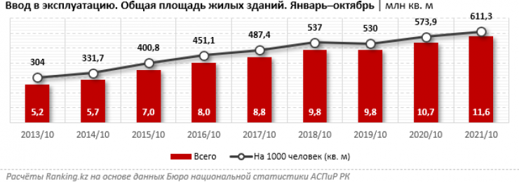 Аналитики отмечают, что нехватка жилья для населения остается в Казахстане острой проблемой и решается ускоренным развитием жилищного строительства: так, за десять месяцев в стране уже ввели в эксплуатацию 11,6 миллиона квадратных метров жилья, что на 7,9 процента больше, чем годом ранее. На тысячу человек объем ввода жилья составил 611,3 квадратного метра (+6,5 процента за год).
