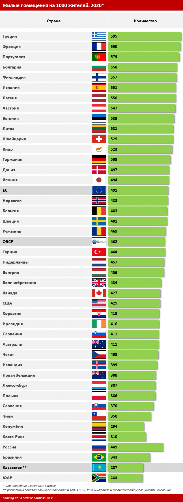 В ЕС, по данным рейтинга ОСЭР, на тысячу жителей в среднем приходится 491 жилое помещение. У лидера рейтинга - Греции - 595 помещений на тысячу жителей, во Франции - 590 помещений. Казахстан также значительно уступает по этому показателю России (449 помещений на тысячу человек) и Бразилии (343 помещения на тысячу человек).