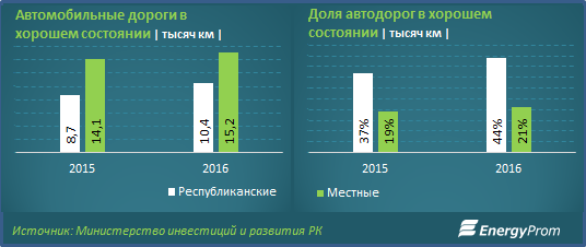 На 1 января 2017 года 44 процента автодорог республиканского значения находятся в хорошем состоянии, 41 процент - в удовлетворительном и 15 процентов - в неудовлетворительном. Развитие автодорожной инфраструктуры с учетом вышеприведенных ресурсов будет содействовать увеличению удельного веса дорог в хорошем состоянии, в 2017 году – до 48 процентов, а к 2019 году – до 52 процентов от общей протяженности дорог.