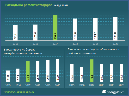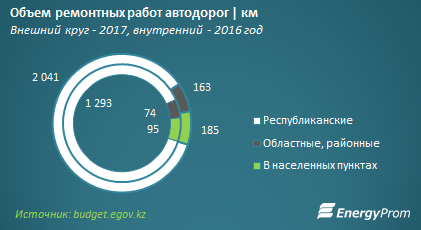 В этом году госсектор запланировал провести средний и капитальный ремонт дорог республиканского, областного и районного значения на 2,4 тысячи километра, что на 63 процента превышает объем работ прошлого года.