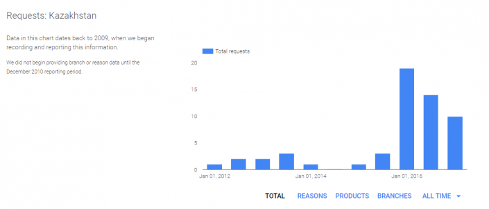 Всего с 2011 по 2016 год зарегистрировано 56 обращений из Казахстана об удалении 960 публикаций сервисов компании. Почти все запросы были отправлены должностными лицами и только один - судом (в 2016 году).