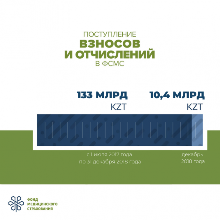Сумма поступлений в счет обязательного социального медицинского страхования с 1 июля 2017 года по 31 декабря 2018 года составила 133 миллиарда тенге, передает Tengrinews.kz со ссылкой на пресс-службу фонда.