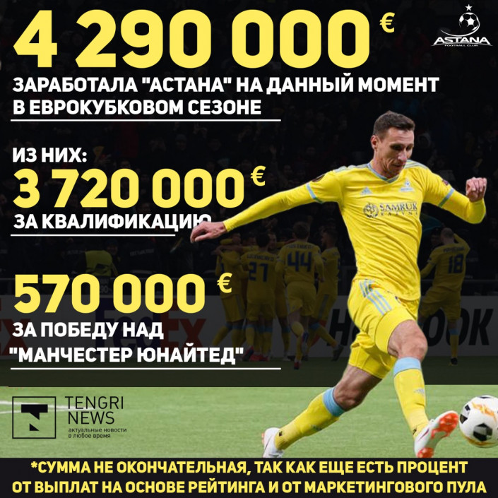 Таким образом, "Астана" на данный момент заработала в еврокубковом сезоне минимум четыре миллиона 290 тысяч евро, из которых 3,720 миллиона - за квалификацию, а 570 тысяч евро - за победу над "МЮ". Эта сумма не окончательная, так как каждый участник получает процент от выплат на основе рейтинга (в нем учитываются выступления за последние десять лет) и от маркетингового пула (продажа ТВ-прав).