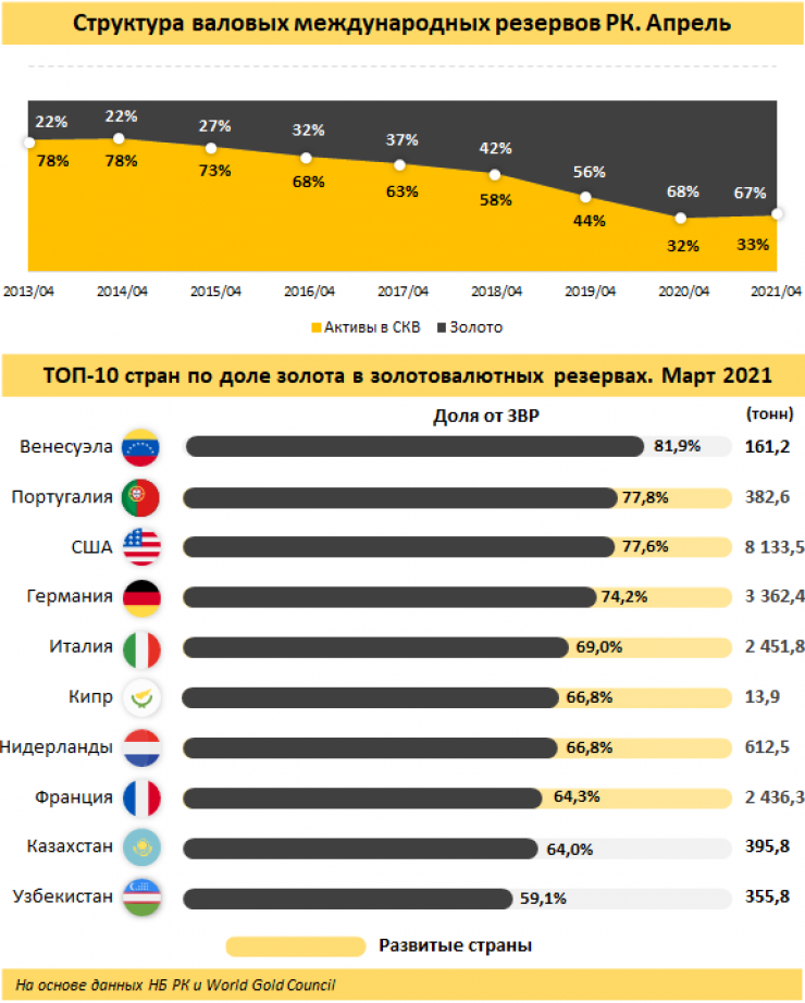 "К примеру, по состоянию на конец марта текущего года в топ-10 стран мира по наибольшей доле золота в резервах вошли 7 развитых стран. Доля золота в ЗВР Португалии составляет 77,8 процента, США - 77,6 процента, Германии - 74,2 процента, Италии - 69 процентов, Кипра - 66,8 процента, Нидерландов - 66,8 процента, Франции - 64,3 процента. Казахстан в свою очередь занял девятое место в топовой десятке", - отмечает издание.
