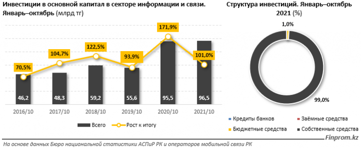 Рост скорости интернета, по данным исследования, напрямую связан с ростом инвестиций в сектор со стороны мобильных операторов. До 2020 года инвестиции показывали то рост, то спад. Однако из-за начала пандемии наблюдается значительный рост инвестиционной активности. По итогам десяти месяцев 2021 года сумма капиталовложений в телеком составила 96,5 миллиарда тенге. В то же время с 2016 по 2019 год она варьировалась от 46 до 55 миллиардов тенге за год.