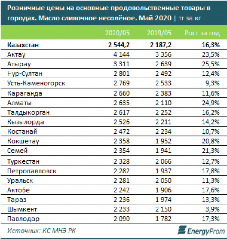 Дороже всего среди крупных городов и мегаполисов страны сливочное масло стоило в Актау, Атырау и Нур-Султане.
