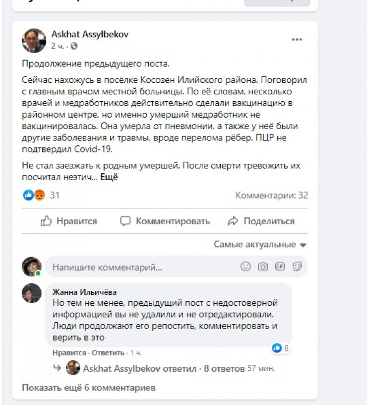 В социальной сети Facebook появилось сообщение о том, что в Илийском районе Алматинской области от прививки против коронавируса скончалась врач-гинеколог. Информацию опровергли в Министерстве здравоохранения, передает Tengrinews.kz со ссылкой на Stopfake.kz.