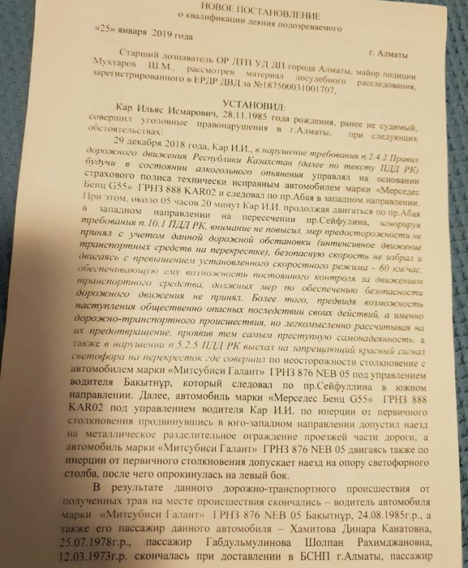Ранее в прокуратуре Алматы сообщили, что Ильяс Кар обвиняется в нарушении правил дорожного движения, повлекшем по неосторожности смерть трех лиц, и оставлении места дорожно-транспортного происшествия (статья 345, часть 4 и статья 347 УК РК).
