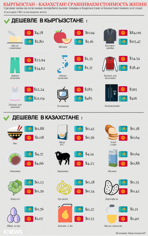 По данным издания, в Кыргызстане дешевле оказались сливочное масло, яблоки, мужские костюмы, носки, телевизоры и холодильники. В Казахстане можно дешево купить рис, муку, хлеб, мясо, молоко, капусту, лук, картофель, яйца, бензин и подсолнечное масло.