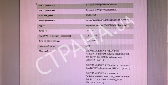 В качестве доказательства издание приводит фото выписки из реестра МВД, где указано место рождения Марины Порошенко.