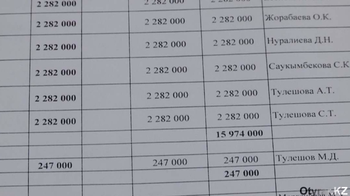 "Все они занимали эти должности формально. Никогда на работу не приходили, заработная плата их составляла по 2 миллиона 282 тысячи тенге в месяц. В то время, когда у нас были такие зарплаты у руководящих, простые рабочие получали по 25-28 тысяч тенге", - добавила начальник Отдела по управлению кадровыми и трудовыми отношениями.