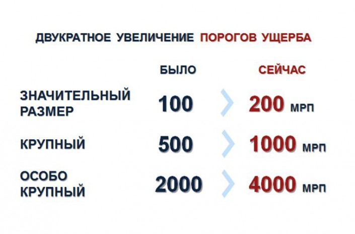 По преступлениям против собственности, в сфере экономики и некоторым другим в два раза увеличиваются пороги значительного, крупного и особо крупного размеров ущерба, необходимых для наступления уголовной ответственности.