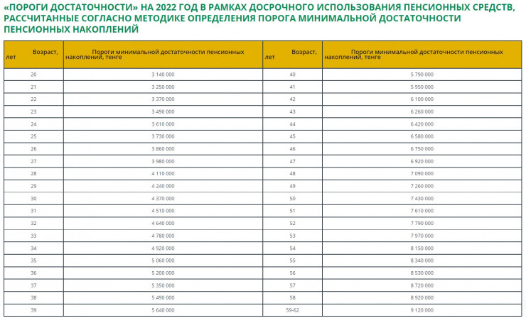Так, согласно данным на сайте ЕНПФ, с 2022 года для 20-летних порог достаточности будет составлять 3,1 миллиона тенге. Сейчас - 1,7 миллиона тенге.