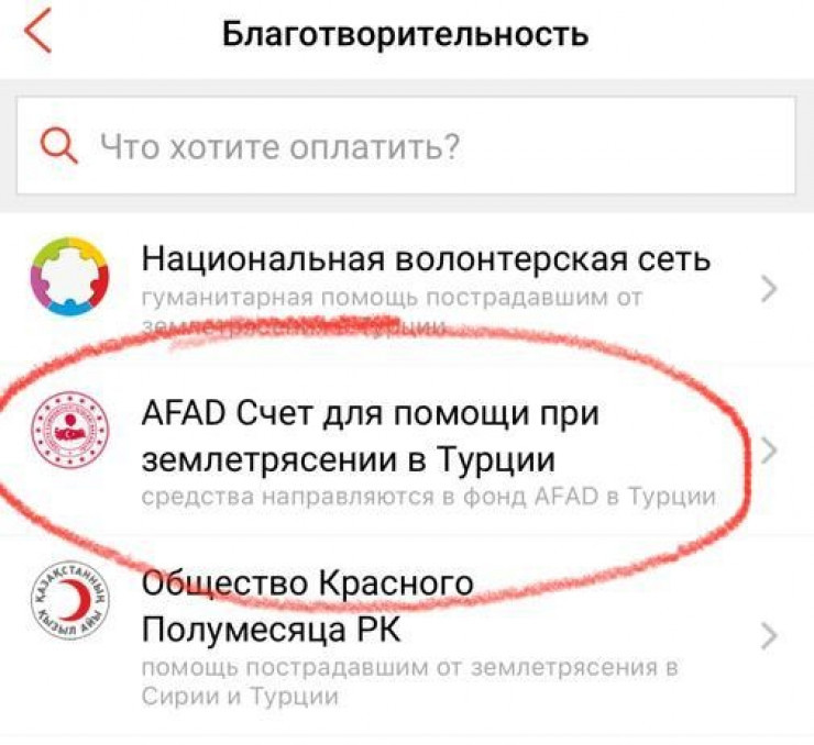 В посольстве Турции отметили, что деньги можно также перевести через приложение Kaspi.kz через фонд AFAD. Функцию можно найти в разделе "Платежи" - "Благотворительность".