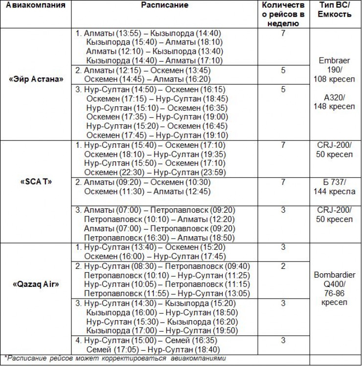 Составлено расписание авиарейсов, которые с 4 мая начнут выполняться тремя авиакомпаниями Казахстана из  Нур-Султана и Алматы в Кызылорду, Усть-Каменогорск, Семей и Петропавловск, передает Tengrinews.kz со ссылкой на пресс-службу Комитета гражданской авиации.