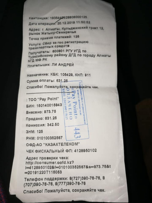 "СпецЦОНов в городе так много, поэтому решил поехать в тот, который находится на Кульджинском тракте. В справочной меня спросили, один или два номера хочу поменять. На ответ "один" мне сказали, что "один поменять нельзя, можно только два, и для этого необходимо заплатить 12 тысяч тенге в кассе". Тут столкнулся с первой проблемой. На кассе принимаются только наличные, поэтому пошел в банкомат снимать деньги. После оплаты на кассе мне дают аж три квитанции. Произошла оплата регистрации автомобиля, нового техпаспорта и выдачи госномера", - поделился Андрей Ли.