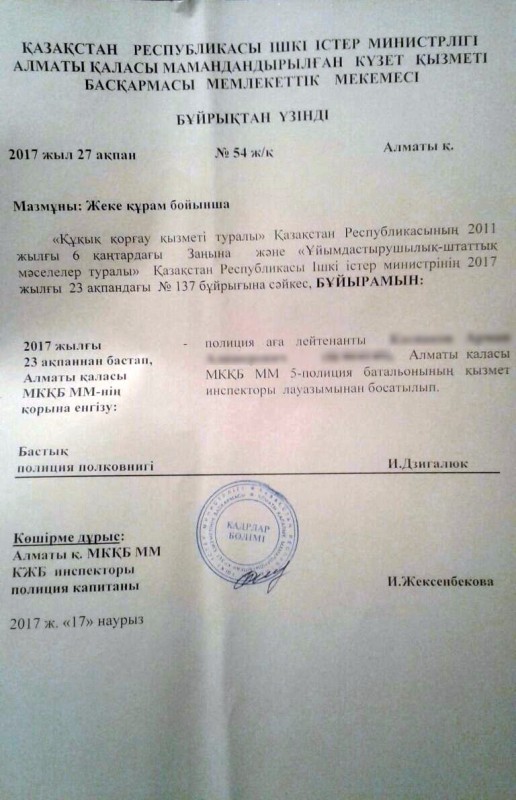 "В дальнейшем из указанного количества сотрудников (35 человек. - Прим. автора) несколько человек были отправлены на пенсию, а остальные получили уведомления об увольнении из органов внутренних дел. По "чистой" случайности ими почему-то оказались именно те сотрудники, которые подписали вышеуказанное коллективное заявление, по которому ведется досудебное расследование. Наши требования об ознакомлении с данным приказом и вопросы о том, когда и кем он был подписан, были проигнорированы. Далее руководство УССО требует от нас в принудительной форме подать рапорты о согласии с переводом в Астану, но вновь без ознакомления с приказом. В итоге нам в ультимативной форме заявили об увольнении якобы в связи с сокращением штата и дали десять дней для самостоятельного поиска нового места службы с запретом выхода на работу в УССО. Но самое непонятное заключается в том, что после нашего увольнения якобы в связи с сокращением штата на наши же места набирают новых сотрудников", - говорится в письме сотрудников УССО Алматы.