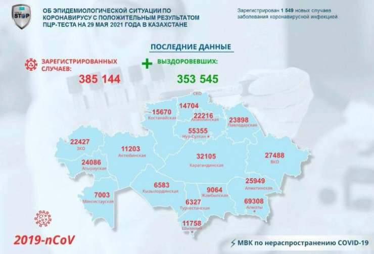 За прошедшие сутки (по данным на 29 мая) в Казахстане зарегистрировано 1 549 новых случаев заболевания коронавирусной инфекцией, передает Tengrinews.kz со ссылкой на МВК по нераспространению COVID-19.