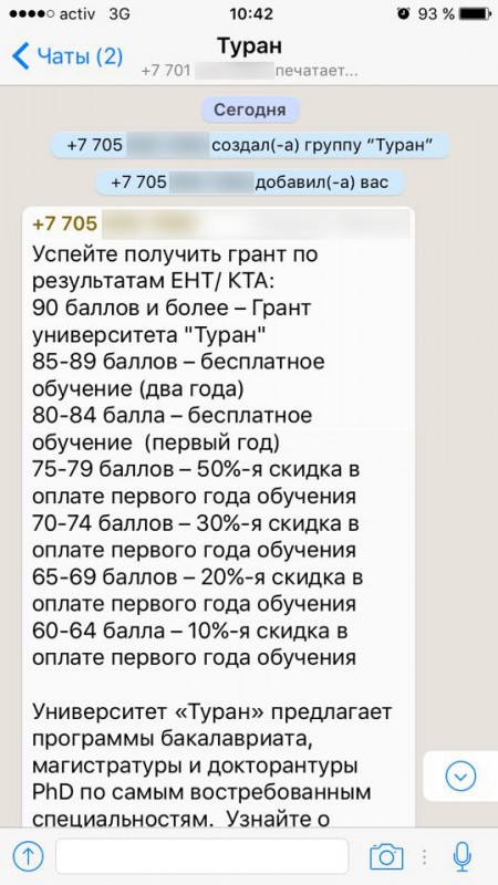 Спамерская WhatsApp-группа с предложениями грантов в вузе возмутила алматинцев