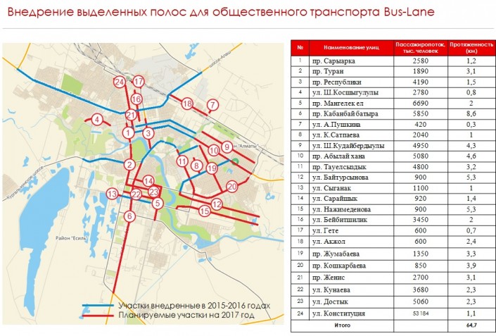 По данным ведомства, выделенные полосы для движения общественного транспорта Bus Lane в 2017 году планируется дополнительно внедрить на 24 участках. Общая протяженность составит 64,7 километра, что повлияет на увеличение средней скорости движения.