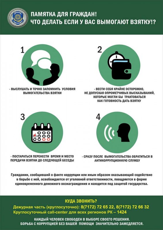 "Гражданам, поделившимся информацией, гарантируется конфиденциальность и правовая защита. В случае подтверждения информации и обвинительного приговора в суде, заявитель сможет получить до 240 тысяч тенге", - уточнил глава Агентства по делам госслужбы и противодействию коррупции.