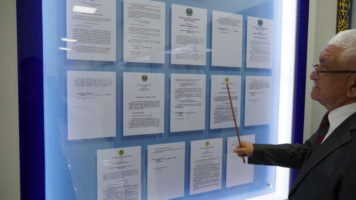 "Мы концептуально все пересмотрели. У нас отправная точка - день указа Президента Казахстана о преобразовании органов КГБ в КНБ. С 1992 года у нас пошел отчет современной истории", - рассказывает сотрудник музея и подводит к первому стенду. На нем указ Президента от 13 июля 1992 года.