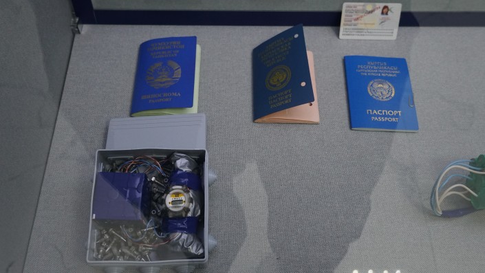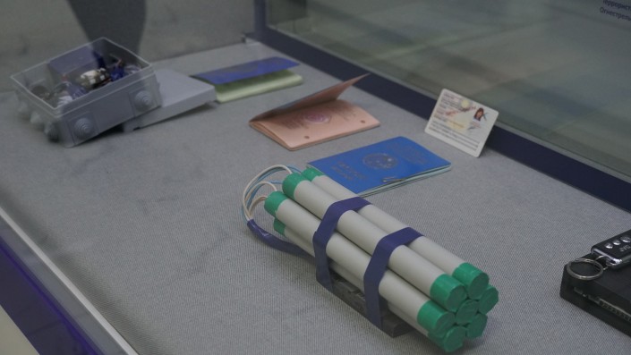 Чуть ниже у стенда лежат макеты взрывных устройств, которые готовили задержанные террористы. Рядом документы подозреваемых. Все они поддельные.