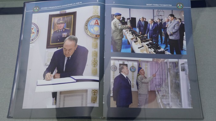 "Вот вы видите, на фото в первом ряду идет процесс подготовки учений по антитеррористической деятельности. Второй ряд - на снимках показан процесс задержания террористов. Вот группа террористов задержана: это гражданин РК, экстрадируется за террористическую деятельность из другой страны", - рассказывает сотрудник музея.