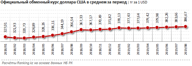 Официальный обменный курс доллара в среднем за август 2019 года составлял 386,67 тенге - на 0,8 процента больше, чем в июле.